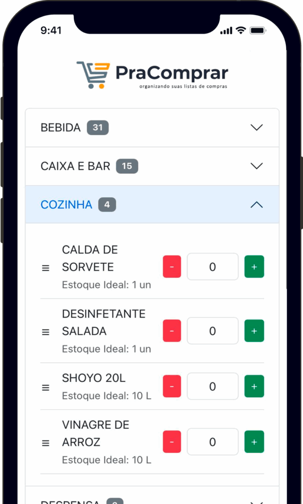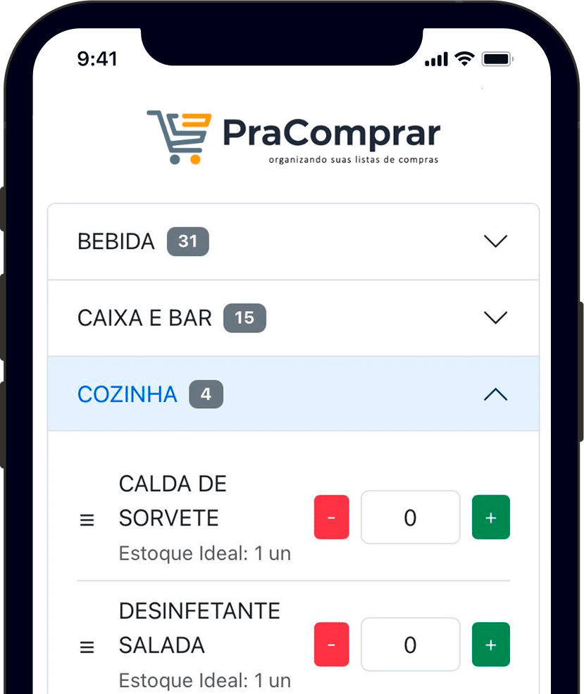 Seu colaborador percorre os setores, preenchendo as quantidades necessárias direto no aplicativo. O sistema pode usar o “Estoque Ideal” como referência para evitar esquecimentos ou compras em excesso, tornando a conferência muito mais segura.