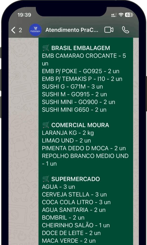 O app organiza todos os itens que você marcou, separa por fornecedor e cria uma mensagem de texto. Ao clicar, ele abre seu WhatsApp com a mensagem pronta para ser enviada ao contato que você escolher.