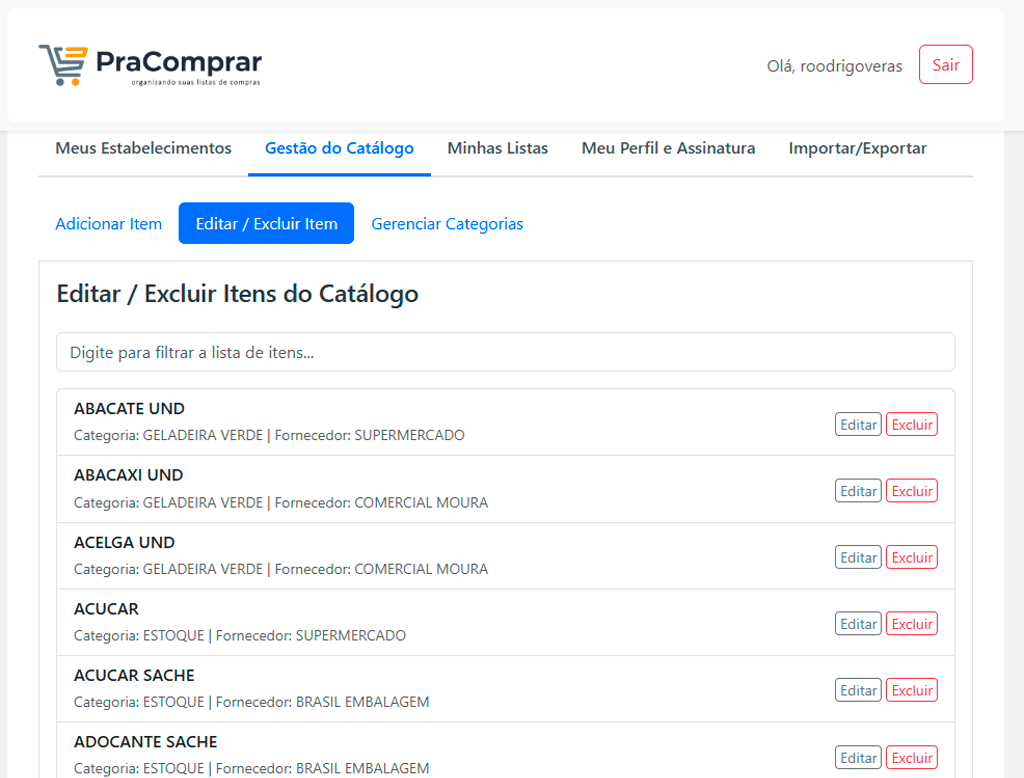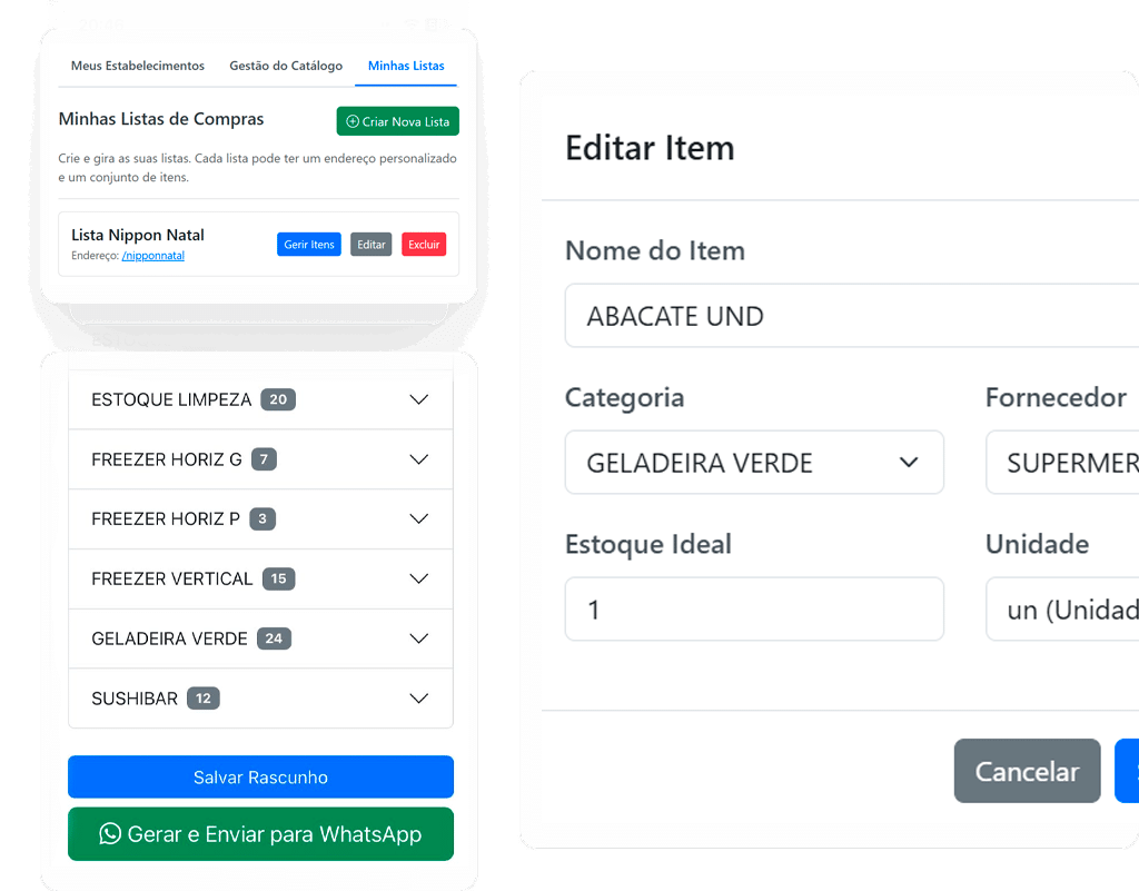A melhor parte é a lista que já sai dividida por fornecedor. Envio o pedido do hortifruti para um, o de embalagens para outro, tudo com um clique. Economizo fácil uma hora por dia com isso.