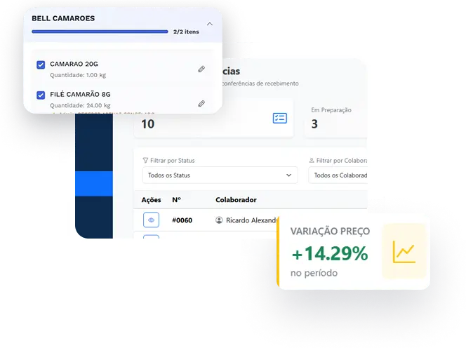 Crie a lista de compras, colete cotações, confira o recebimento e atualize o estoque — tudo dentro da mesma plataforma, em sequência automática.