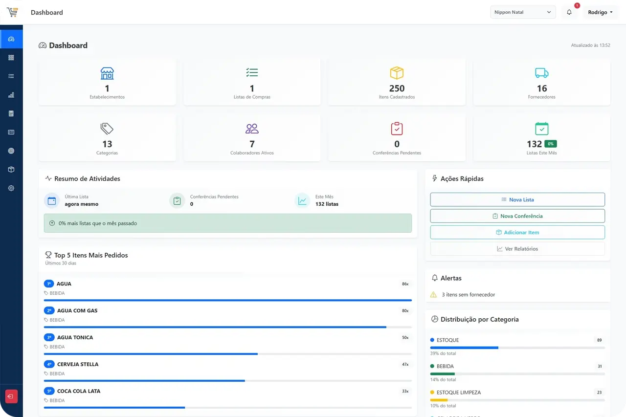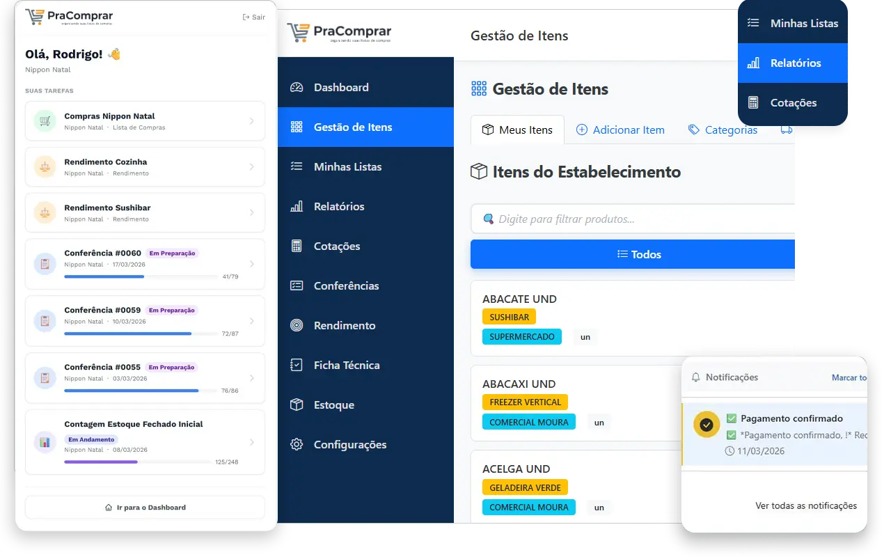 Listas inteligentes, cotações automáticas e controle de estoque em tempo real — tudo que você precisa para comprar melhor e gastar menos.